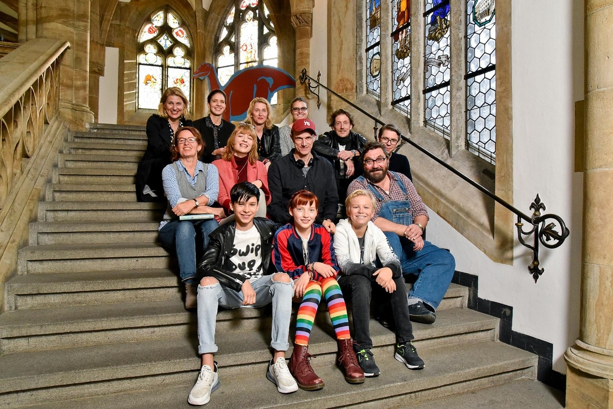 Am vergangenen Freitag verwandelte sich das Münchner Rathaus am Marienplatz zur eindrucksvollen Filmkulisse: in mehreren Räumlichkeiten fanden die Dreharbeiten zum Kinoabenteuer "Die Schule der magischen Tiere" statt. Die Verfilmung der erfolgreichen Kinderbuchreihe von Margit Auer kommt am 26. November 2020 in die deutschen Kinos. Gedreht wird noch bis Mitte November u.a. in den Bavaria Studios und den MMC Studios in Köln. Am Set von "Die Schule der magischen Tiere" im Münchner Rathaus: Hintere Reihe (v.l.n.r.): Die Produzentinnen Alexandra Kordes (Kordes & Kordes Film), Cosima von Spreti (Leonine), Meike Kordes (Kordes & Kordes Film), Laura Clever (Clever Production) sowie VFX-Verantwortlicher Christian Sommer (Trixter). Mittlere Reihe (v.l.n.r.): Margit Auer (Buchautorin), Viola M.J. Schmidt (Drehbuchautorin), Gregor Schnitzler (Regisseur), Heiko Pinkowski ("Wondraschek"), Lars Nitschke (FFF Bayern, Film Commission Bayern). Vordere Reihe (v.l.n.r.): Loris Sichrovsky ("Jo"), Emilia Maier ("Ida"), Leonard Conrads ("Benni"). Foto: Universum Film/ab-bild.de (PR-Veröffentlichung)
