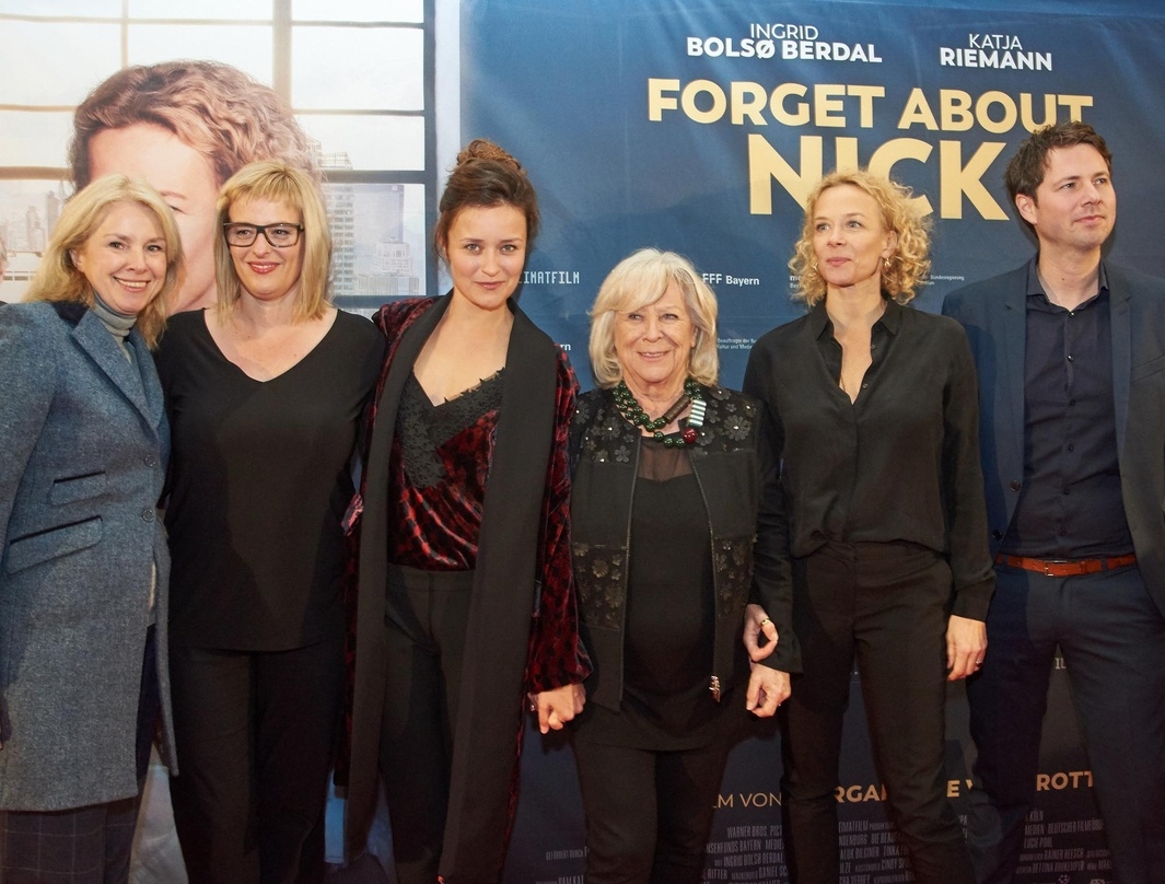 In der Essener Lichtburg hat gestern Margarethe von Trottas Geschichte um zwei Ex-Frauen eines Womanizers, die zunächst widerwillig in einem schicken Loft zusammen wohnen und sich letztlich doch zusammenraufen, "Forget About Nick", seine Premiere gefeiert. Über großen Applaus freuten sich (v.l.n.r.): Britta Lengowski (Film- und Medienstiftung NRW), Produzentin Bettina Brokemper (Heimatfilm), Darstellerin Tinka Fürst, Margarethe von Trotta, Darstellerin Katja Riemann und Stefan Vochezer (Marketing Manager New Releases Warner Bros.). Warner Bros. startet "Forget About Nick" am 7. Dezember in den deutschen Kinos. Foto: Warner Bros. / Daniel Gasenzer (PR-Veröffentlichung)