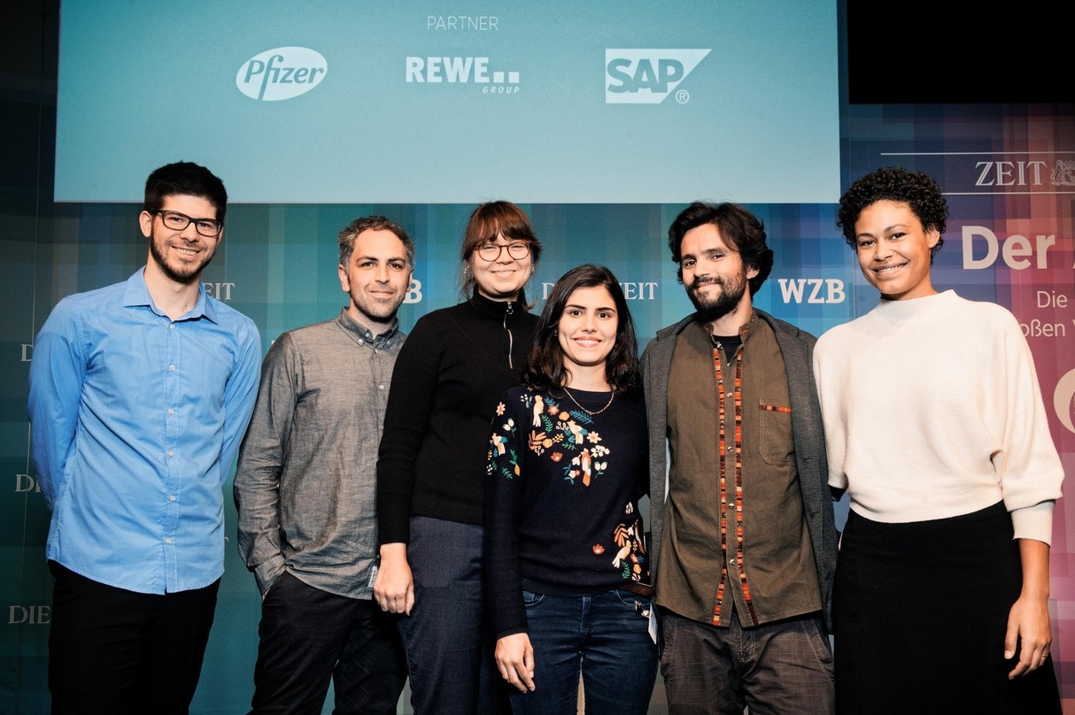Im Rahmen der von der "Zeit", dem infas Institut für angewandte Sozialwissenschaft und dem Wissenschaftszentrum Berlin für Sozialforschung (WZB) initiierten Vermächtnisstudie hatte die Deutsche Filmakademie Produktion zum Kurzfilmwettbewerb unter dem Motto "Die Welt, die wir uns wünschen" aufgerufen. Im Rahmen der gestrigen "Zeit"-Konferenz in Berlin sind jetzt die Sieger ausgezeichnet worden, deren Filme auf www.deutschland.de. zu sehen sind (v.l.n.r.): Jannis Alexander Kiefer ("Comments"), Omri Aloni und Britta Strampe ("MONDAY - A German Love Story"), Cléo Campe und Pedro Harres ("Ertrinken"), Merle Grimme ("Ein deutscher Kinderwunsch?"). Foto: Florian Liedel/Deutsche Filmakademie (PR-Veröffentlichung)...