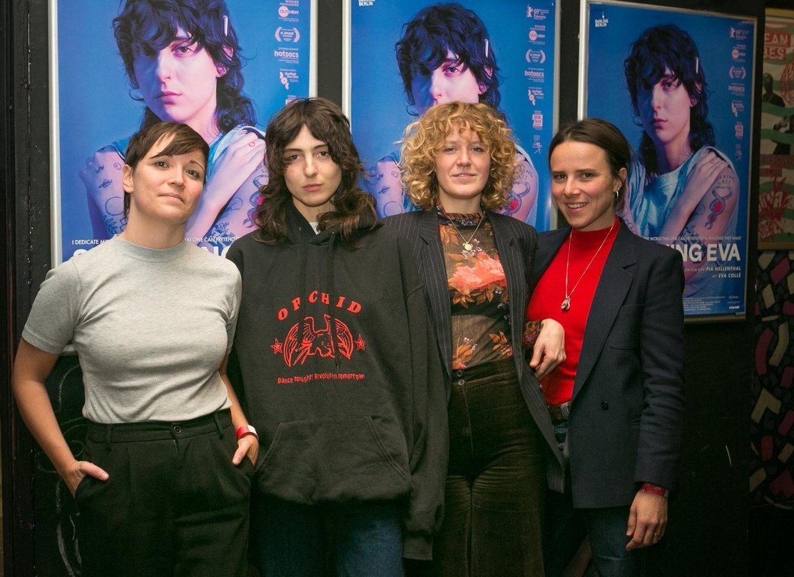 Der Dokumentarfilm "Searching Eva" von Pia Hellenthal feierte gestern Abend seinen bundesweiten Kinostart mit einem Special Screening im Berliner YAAM-Club. Der Film im Verleih von Darling Berlin/UCM.ONE spiegelt in teils inszenierten, aber gleichzeitig dokumentarischen Bildern die vielen Identitäten von Eva Collé wider, die seit Jahren ihre Follower auf Social-Media-Kanälen an ihrem Leben mit allen Höhen und Tiefen teilhaben lässt und dabei eine schonungslose Offenheit zeigt. Auf dem Footo (v.l.n.r.): Mirjam Haas (UCM.ONE/Darling Berlin), Adam F./Eva Collé, Pia Hellenthal (Regisseurin) und Giorgia Malatrasi (Autorin). Foto: Maria Asselin-Roy (PR-Veröffentlichung)