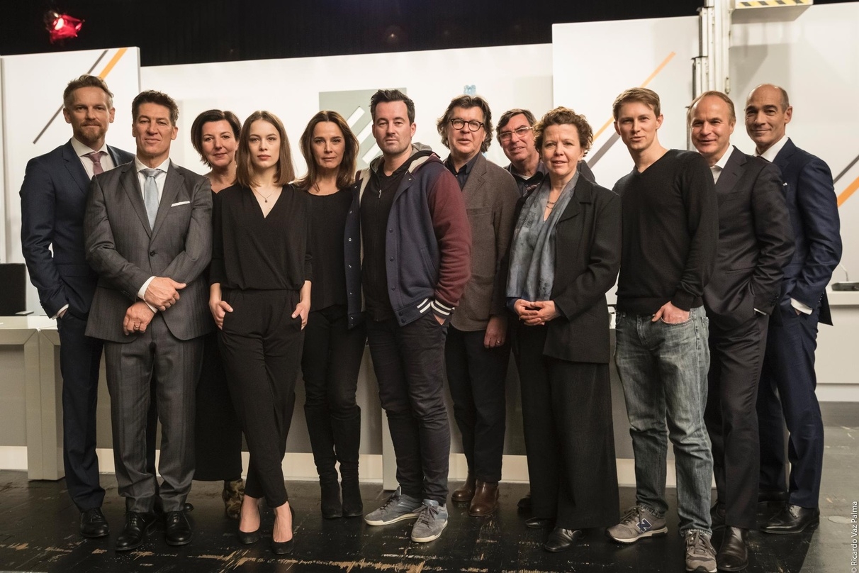 In Frankfurt am Main ist jetzt Christian Schwochows in der Welt der Hochfinanz angesiedelte Letterbox-Serie "Credo" (AT) abgedreht worden. Unser am Set in der Jahrhunderthalle entstandenes Foto zeigt (v.l.n.r.): die Darsteller Barry Atsma und Tobias Moretti, Produzentin Lisa Blumenberg, die Darstellerinnen Paula Beer und Désirée Nosbusch...